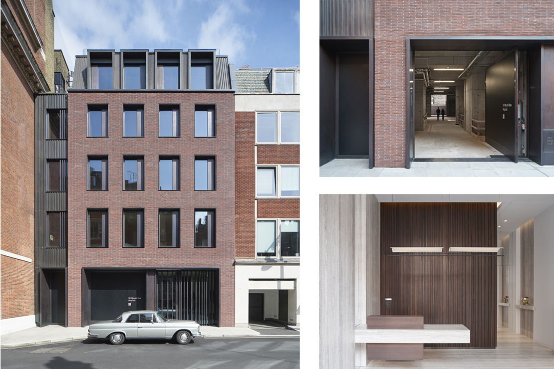 Left: The matt texture of dark roman bricks, handmade in Yorkshire with raked out horizontal mortar joints has been set against the crisp lustre of vertical bronze fins providing a subtle play of light and shadow on the south facing elevation. Top right: Oversized pivot door provides access into the gallery space. Bottom right: The feeling of volume in the lobby to the apartments is enhanced by the striped figuring of the honed slabs of silver travertine on its walls and floor with fumed oak joinery behind a cantilevered travertine desk