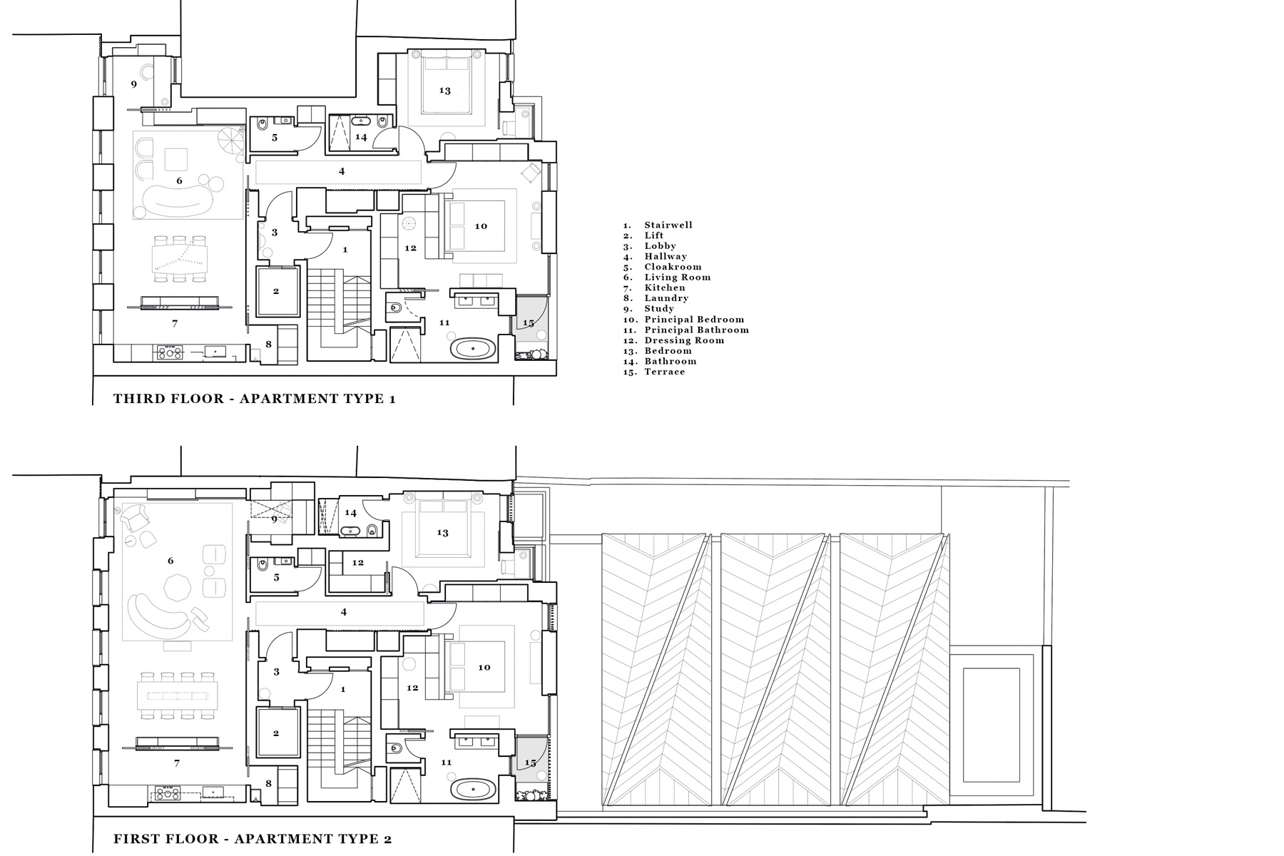 Plan of the first floor apartment showing the ‘origami’ roof over the gallery at the rear. The layout was configured to maximise the sense of space and light by creating long views from the living room all the way through the apartment over sunlit roofscapes and beyond